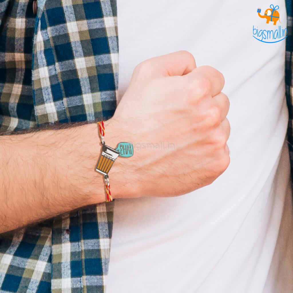 One glass of cutting chai is the solution to all problems. Seems familiar? Probably the last time you heard these pearls of wisdom was from none other than brother dearest. He is all cranky till he gets a cup of piping hot ginger tea, & then the world seems a better place. Tie him the personality specific Bhai-Chaira rakhi and watch him get all misty-eyed with chai-motion. With a brass metal sheet embellishment in the shape of a hot cup of chai with the words, Bhai Chai etched on it.
