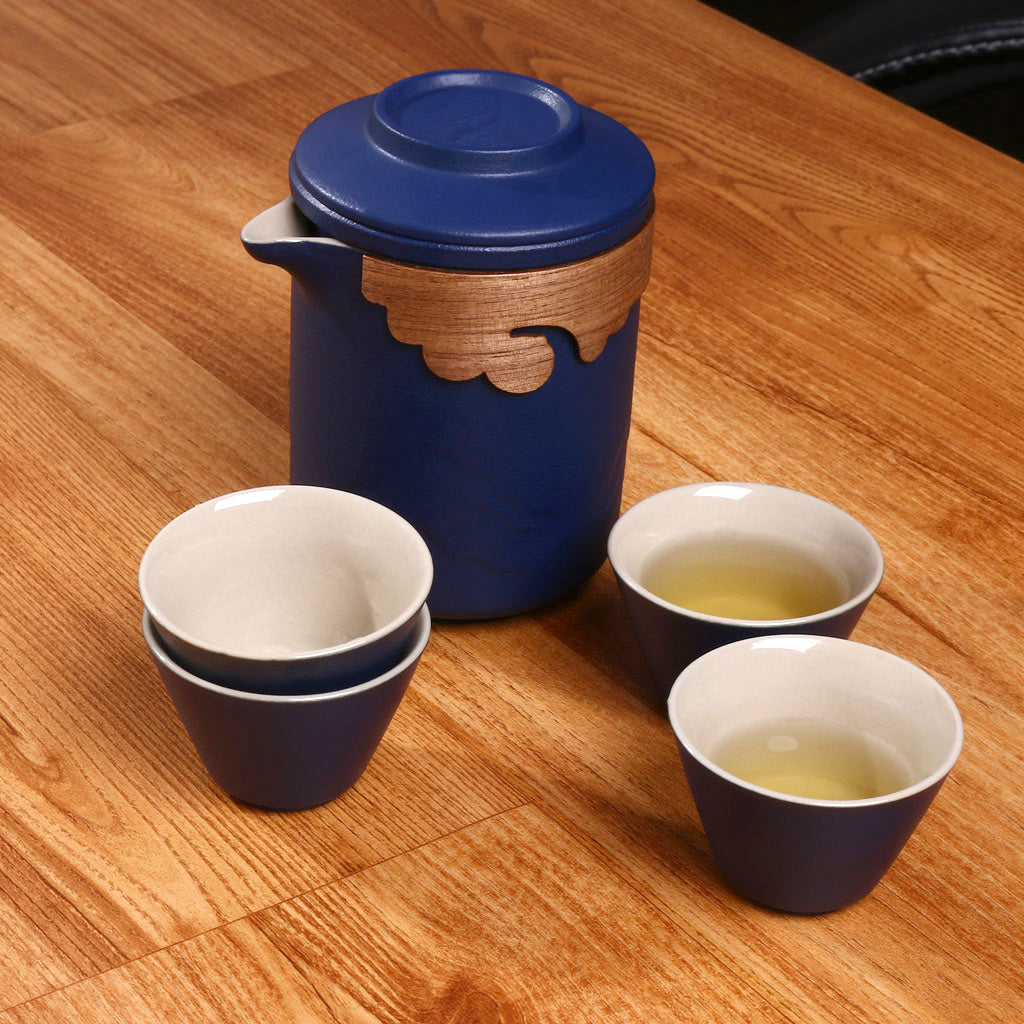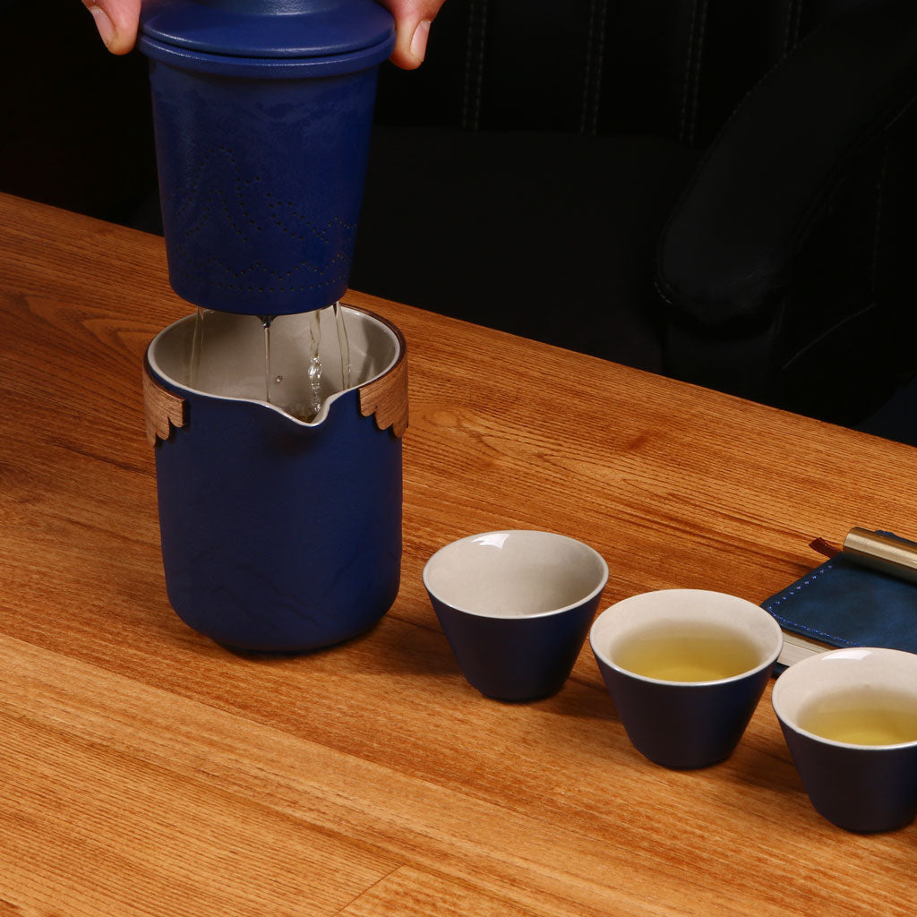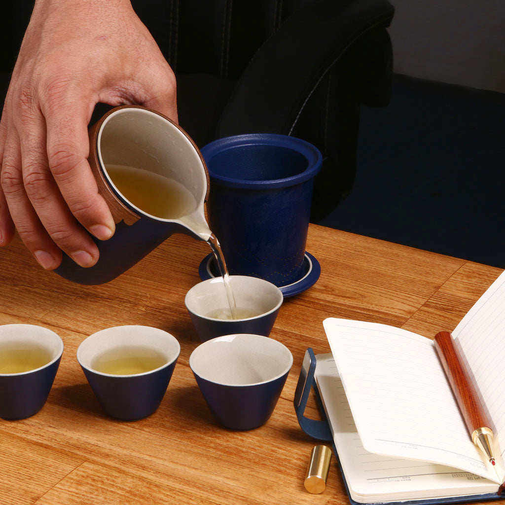 This luxurious portable tea set is crafted for tea lovers who appreciate elegance and convenience. Encased in a sophisticated blue leather-textured briefcase, it includes a teapot with a wooden accent, four ceramic teacups, and a matching leather wallet and pen, making it a perfect gift or travel companion. The minimalist yet refined design blends tradition with modern style for a perfect tea experience anywhere.