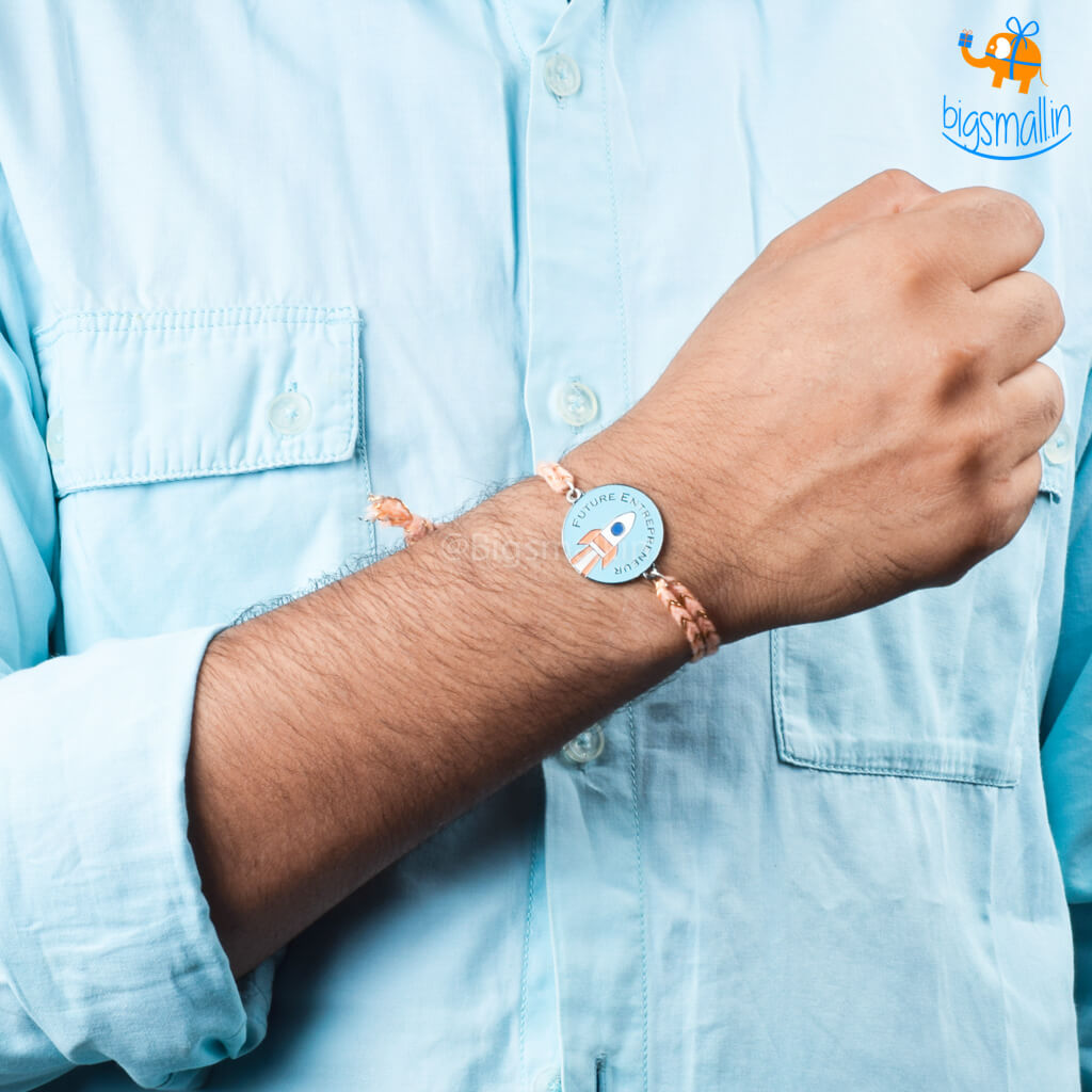 If your brother has always been interested in being his own boss and is working towards that dream, or recently achieved it, then this rakhi is perfect for him. Celebrate your undeniable strong bond in a fun way this Rakhi season with the Future Entrepreneur Metallic Rakhi. With a brass sheet embellishment depicting a rocket taking off to follow its dreams, this is one personality-specific rakhi that your brother won't be taking off anytime soon.