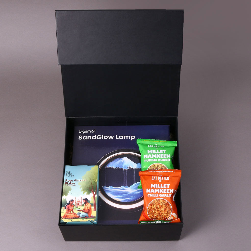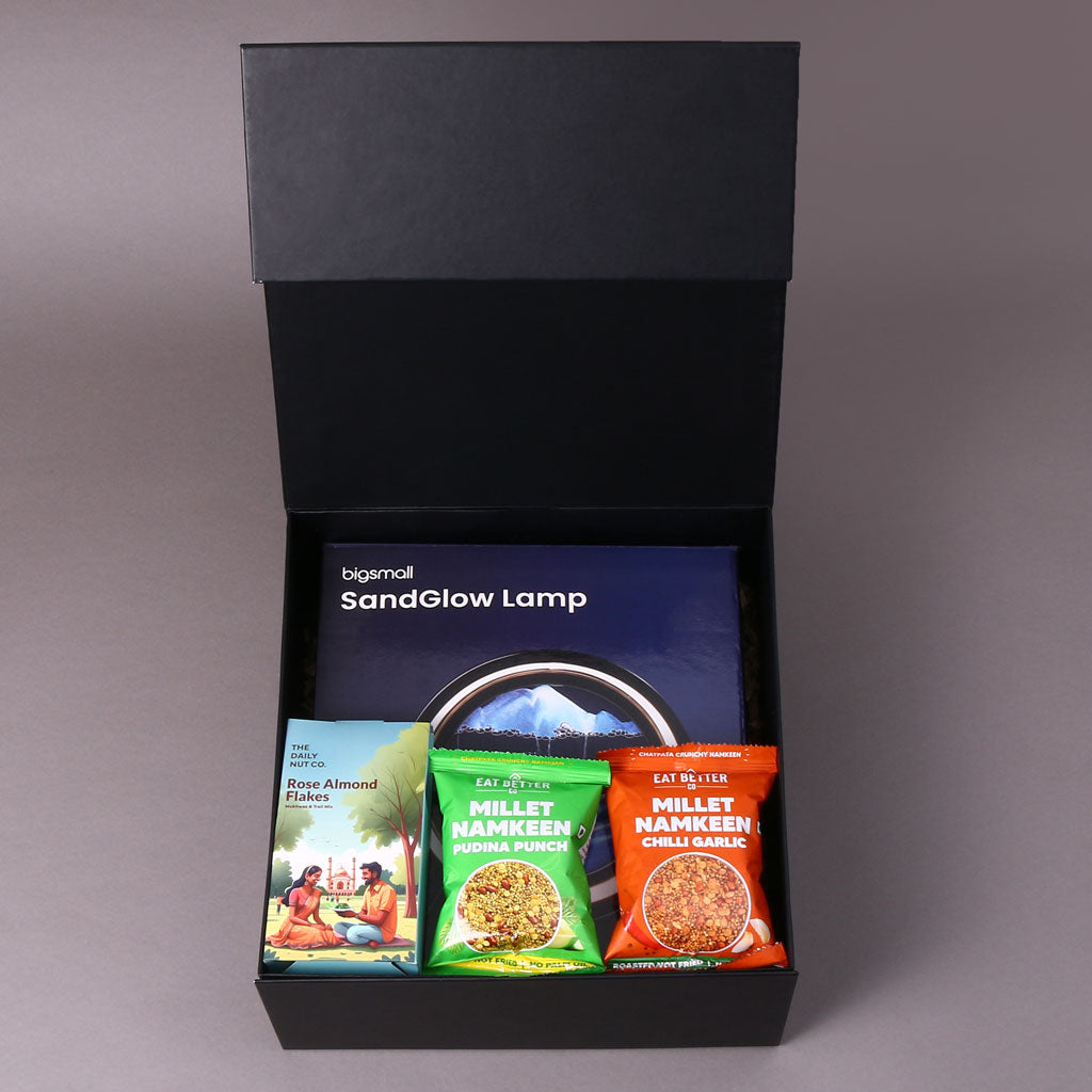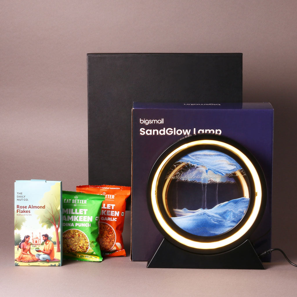 Package Includes: 1 x Sandglow Lamp, 1 x The Daily Nut Co Almonds, 2 x Eat Better Millet Namkeen, 1 x Box