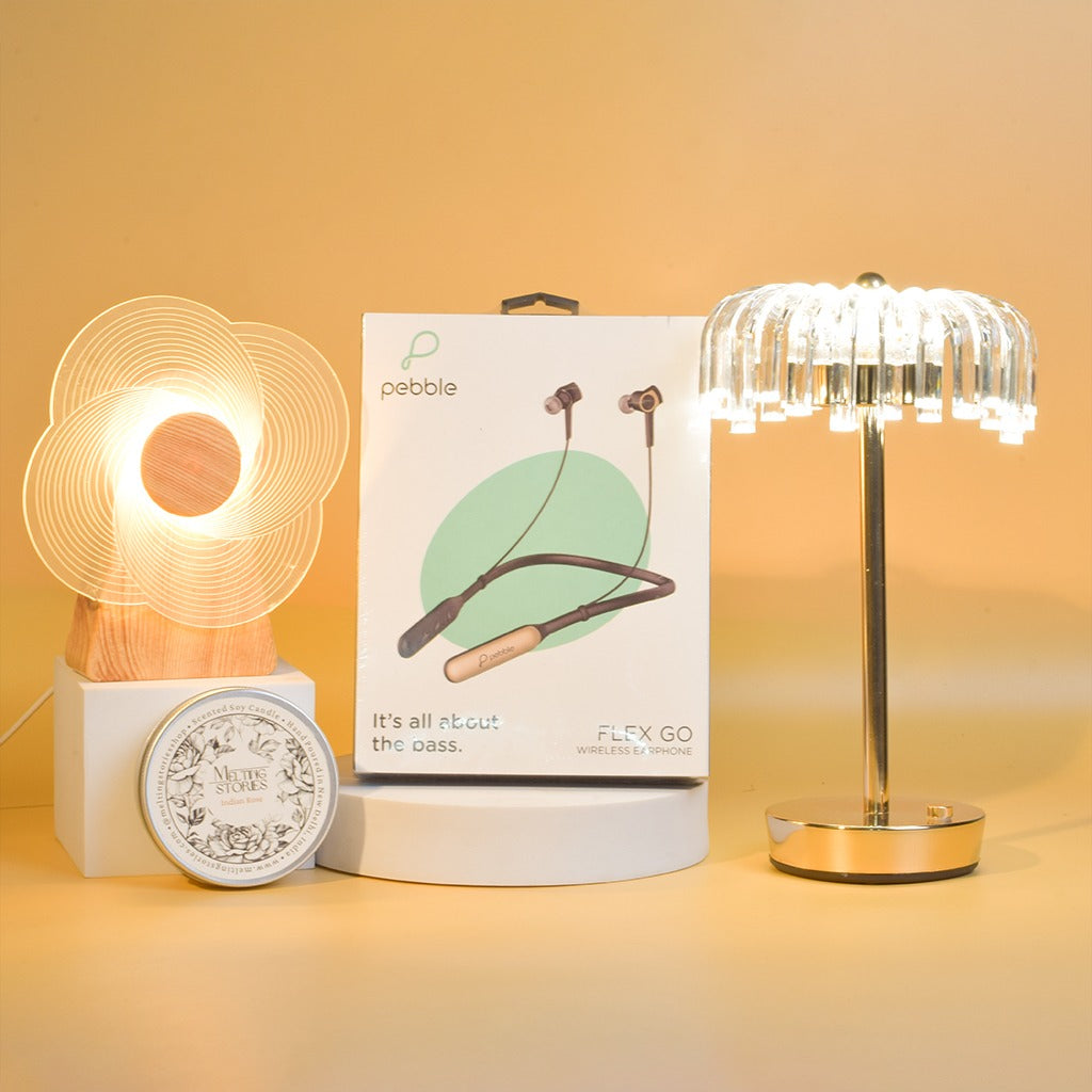 Want to gift something sweet, bright, and unique? The set includes a Rotating LED Windmill Lamp, a Crystal Tree Table Lamp, Bluetooth Headphones, and a Scented candle.