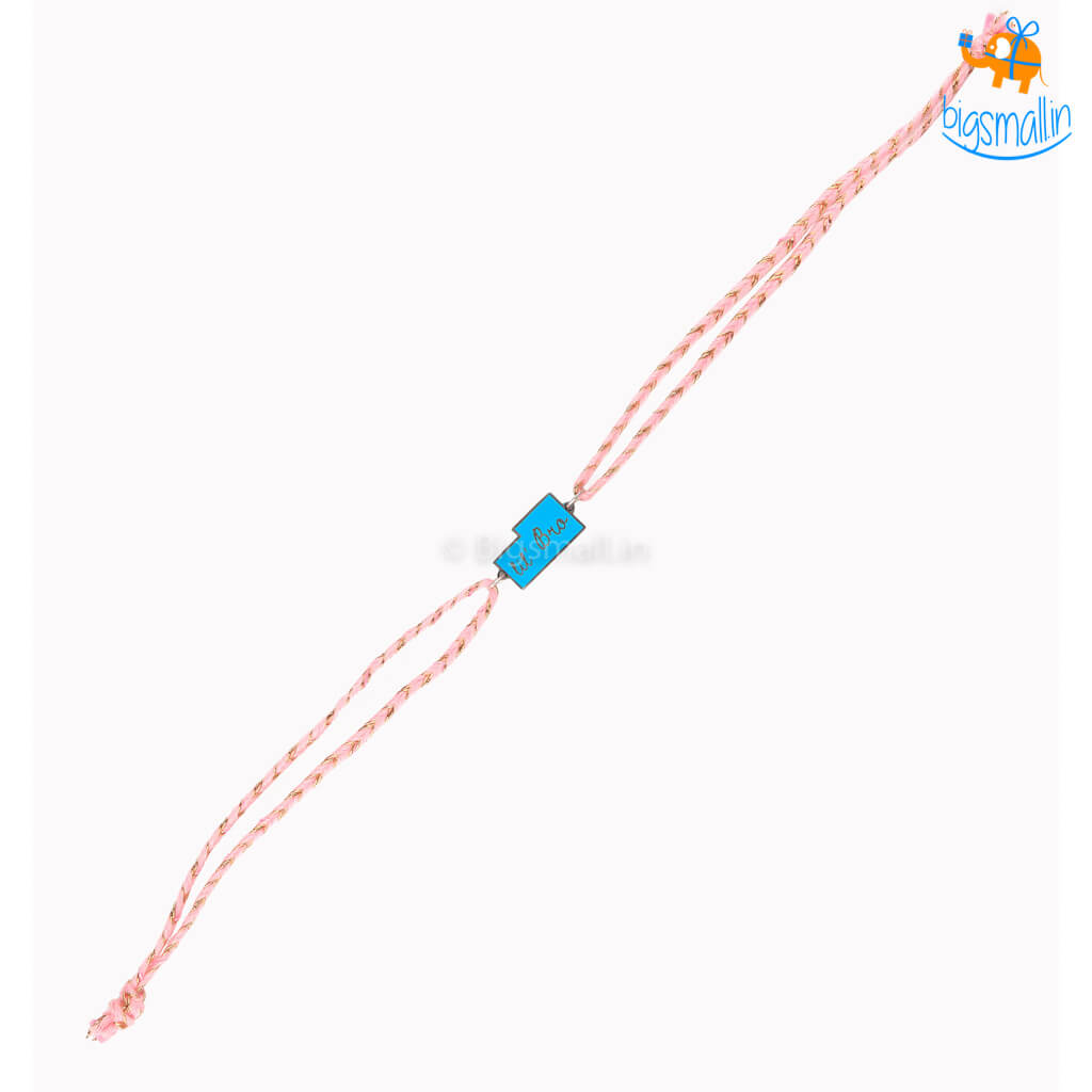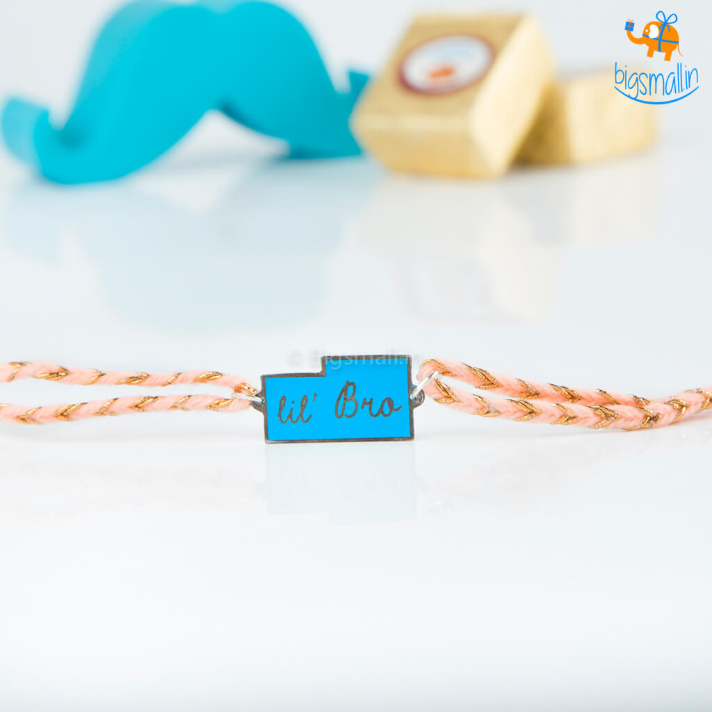 If you have a younger brother chances are that you probably remember the day your mother walked in with her little bundle of joy. You knew what love was when you played with his impossibly tiny fingers & toes. Now that he is all grown up & probably taller than you are, in your heart he will still remain the little munchkin he once was! He may irritate you to no end, claim all your stuff as his birthright, but this young man has got your back. Celebrate your unique bond with the personality-specific Lil' Bro Rakhi. It comes with a beautiful brass sheet in the middle of a peach-colored string that says, "Lil' Bro".