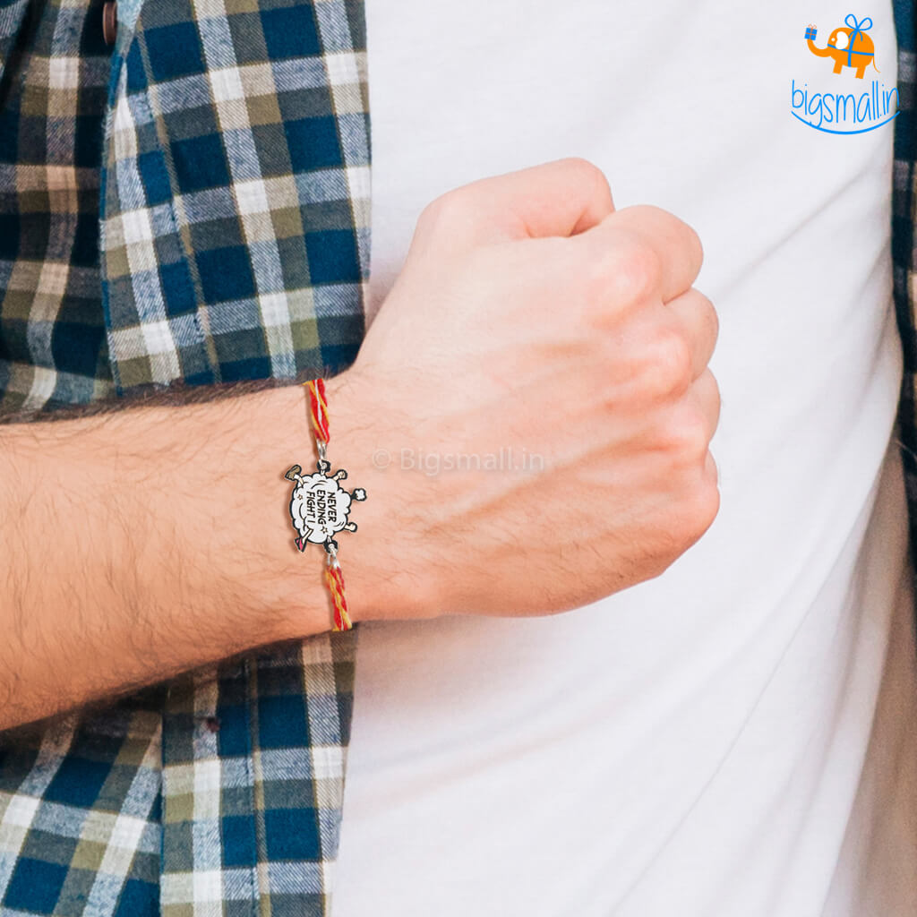 Grew up fighting with your brother? For good or for worse, it only brought you close together in the end. Fought for real or for fun, that time has shaped your relationship into what it is today. Maybe you still can't stop fighting and bicker for fun like old ladies. Celebrate this special bond this Rakhi season with this personality-specific Rakhi. Never-Ending Fight Rakhi that comes with a metal sheet embellishment in the shape of a cartoonish fight cloud with arms and legs sticking out.