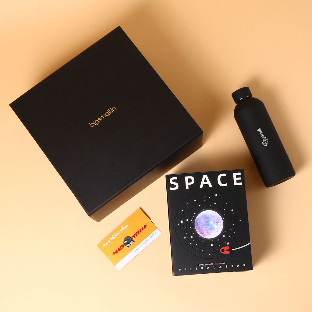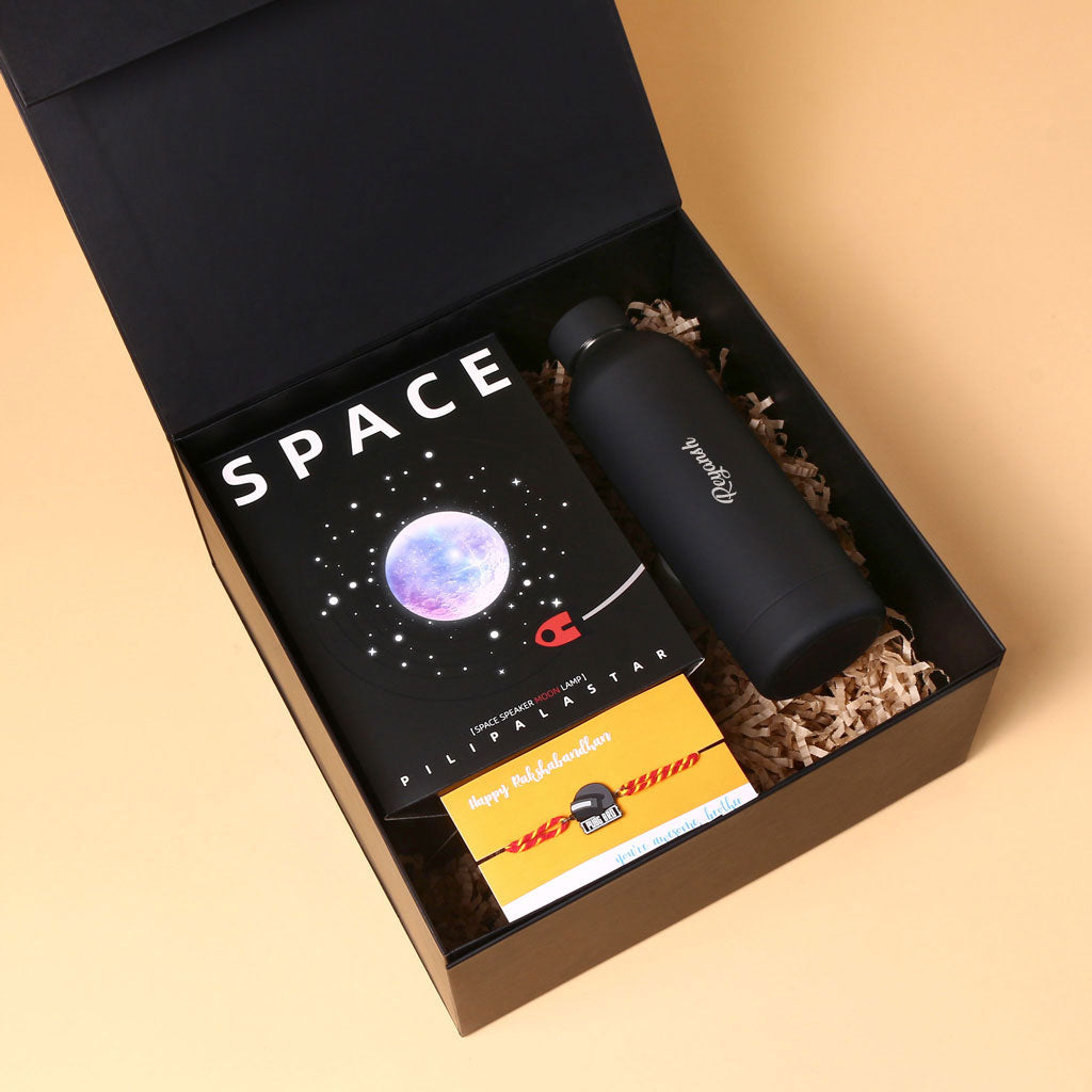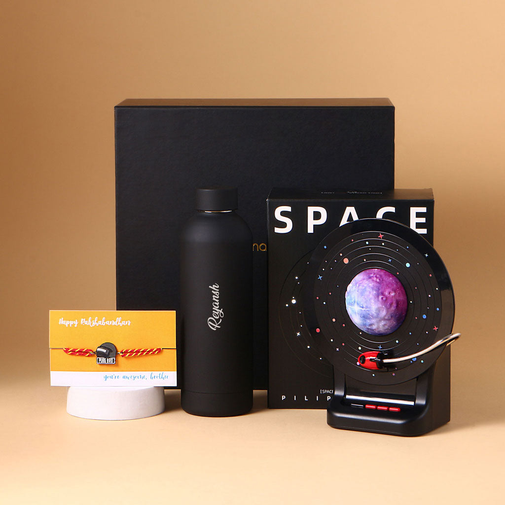 Make Raksha Bandhan special with this unique hamper for your brother. It has a cool space lamp that spins and glows, a black bottle with his name on it, and a fun PUBG rakhi. Packed in a smart gift box, it’s the perfect mix of fun and thoughtful.