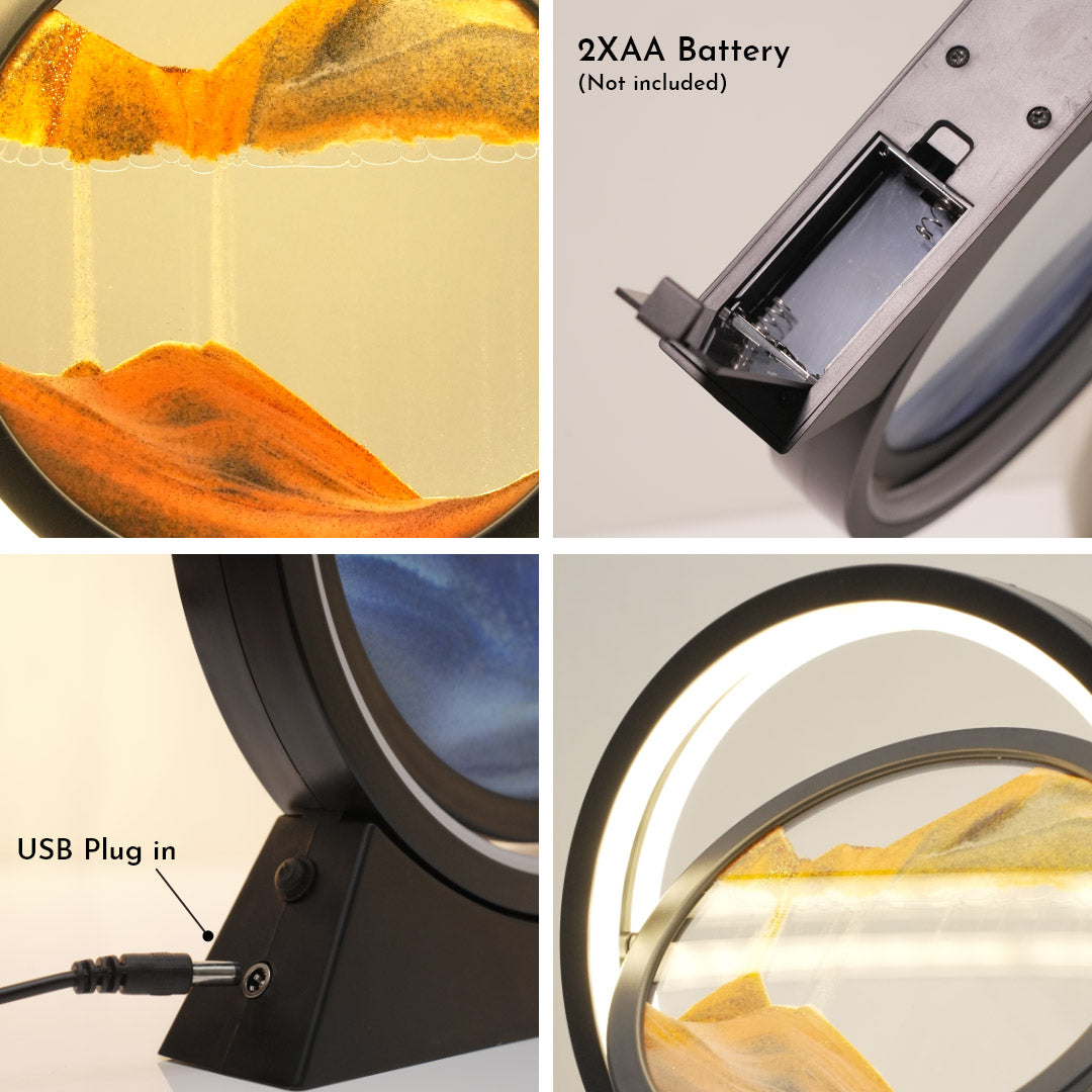 A calming decorative lamp with flowing sand art and ambient lighting, perfect for any space or mood.