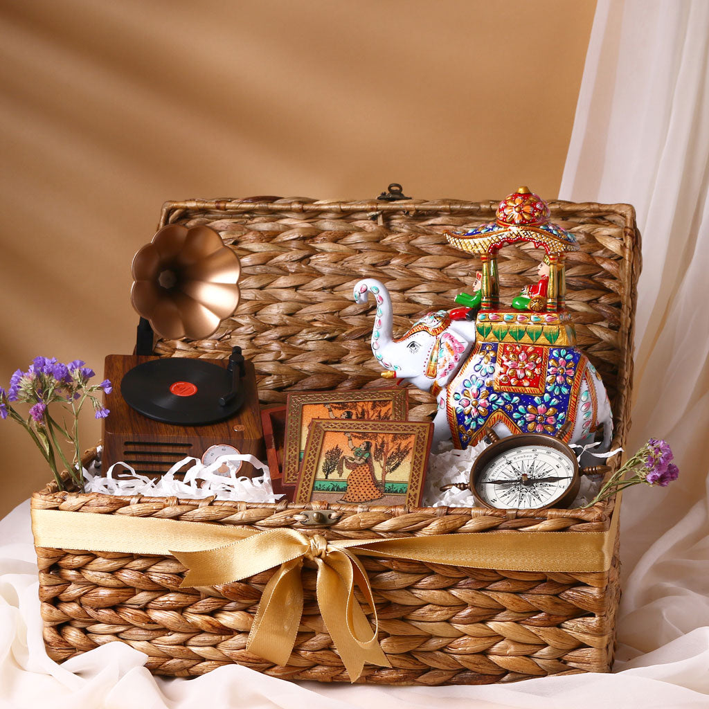 Celebrate the spirit of Indian royalty with this thoughtfully curated The Heritage Charm Gift Box. Featuring a handcrafted Ambari elephant, vintage gramophone, hand-painted Rajasthani coasters, and an antique-style brass compass, each piece reflects timeless artistry and charm. Beautifully presented in a woven basket with golden accents, it’s a perfect gift for those who appreciate heritage, craftsmanship, and elegance.