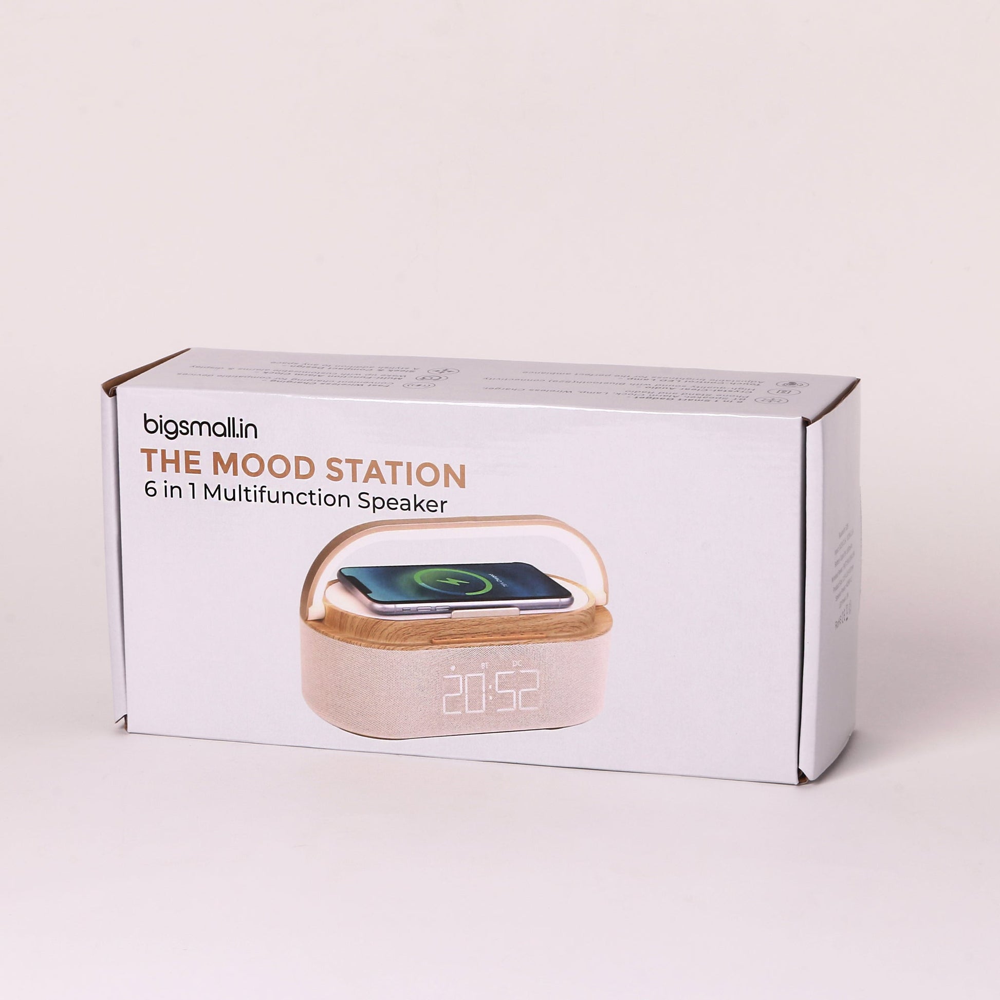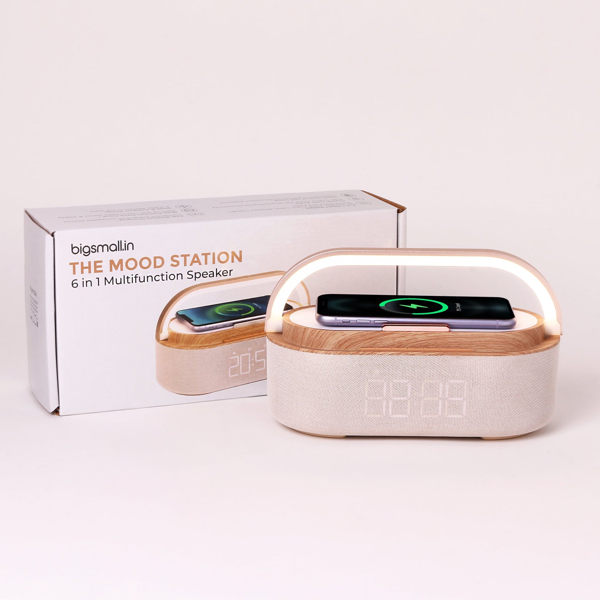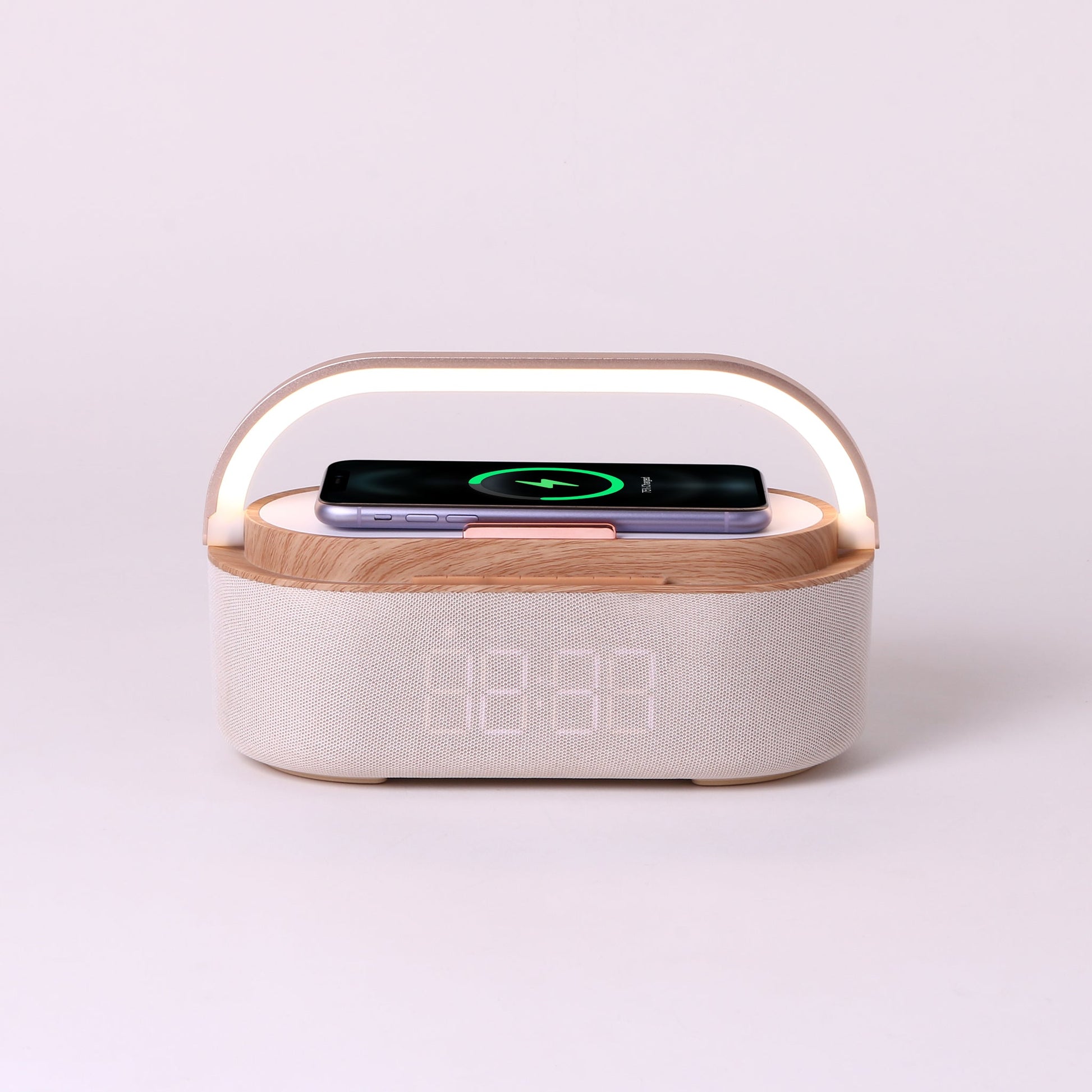 A multifunctional desk essential that combines charging, lighting, audio, and time display in one sleek device.