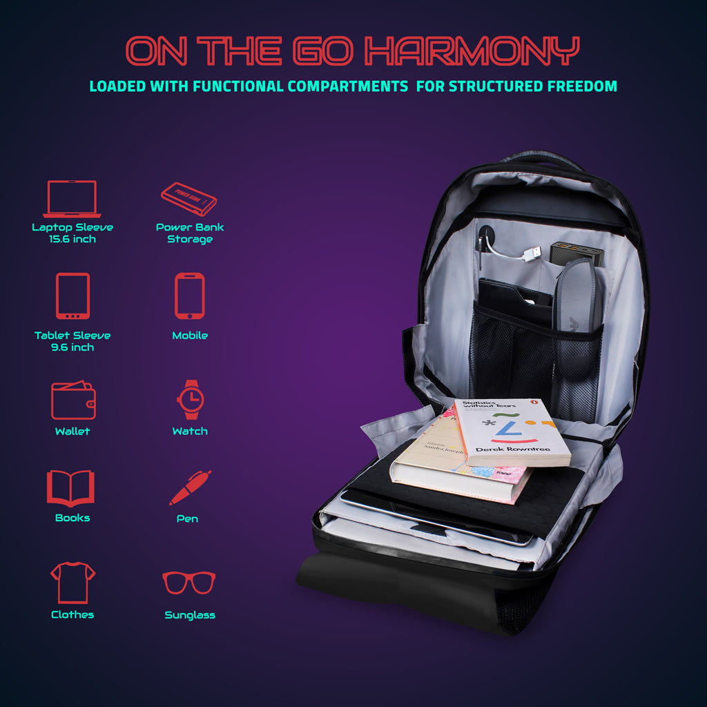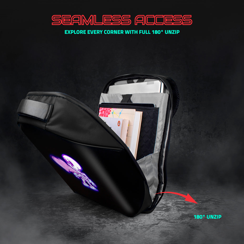 Elevate your school or work experience with the Tech Trend LED Backpack, featuring a vibrant display that adds a modern touch to your style. This sleek and innovative backpack blends technology with sophistication, making it a standout accessory. Stay organized with this campus bag’s dedicated sleeves, fitting laptops up to 15.6 inches and tablets up to 9.6 inches. Its IPX5 water-repellent design keeps your belongings dry, while a secure pocket protects your valuables. Designed for comfort, the ergonomic straps and travel ease hook reduce strain, making it perfect for long days on the go. Ideal for daily use, travel, campus life, and corporate settings, the Tech Trend LED backpack is a perfect blend of style and functionality. With a lightweight 1.3 kg design and a spacious 20L capacity, it’s built for convenience wherever you go.