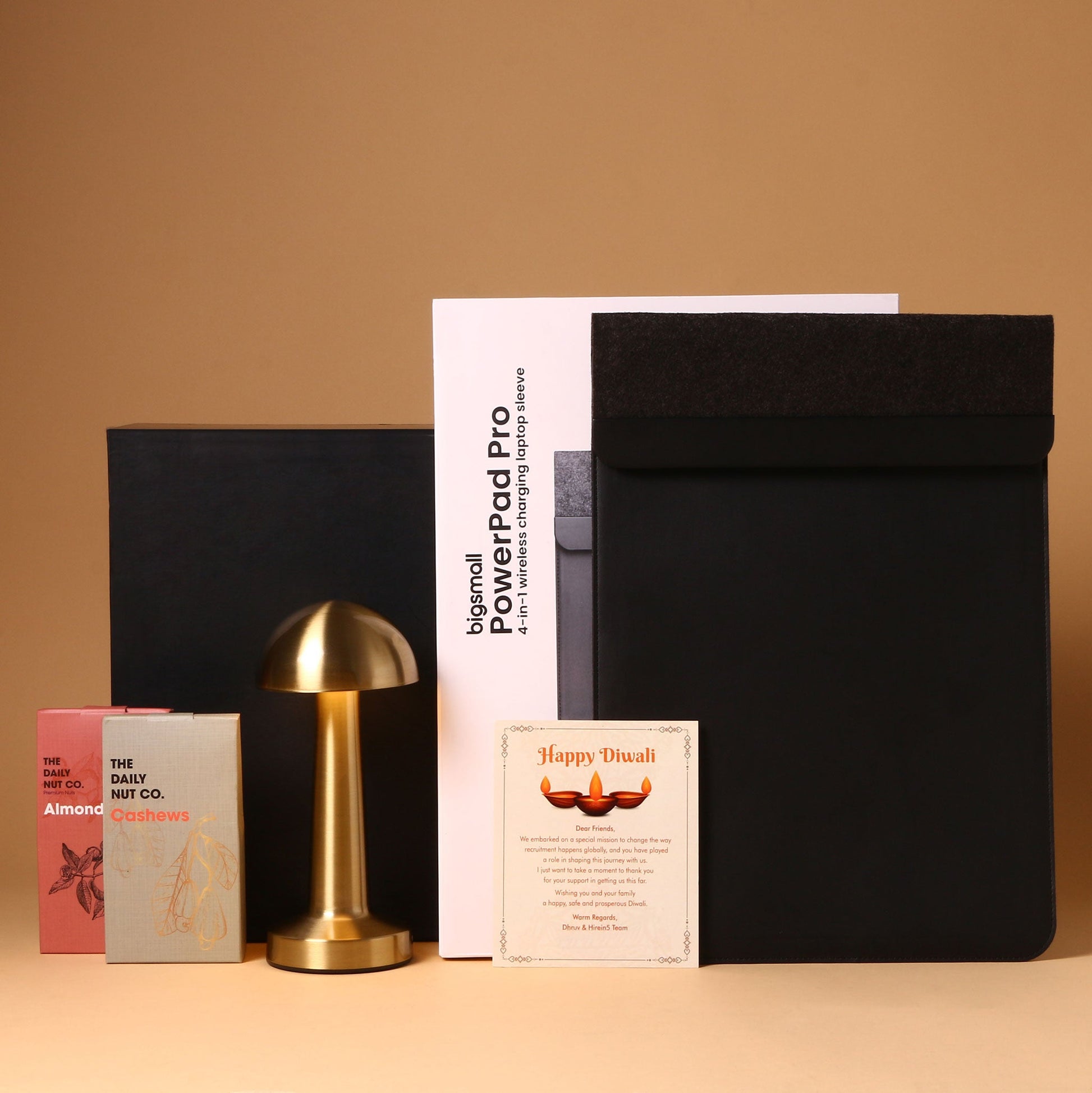 Package Includes - 1 x Power Pad Pro Sleeve (4 in 1), 1 x Aura Dome Metal Table Lamp, 1 x Almonds, and Cashews, 1 x Diwali Card and Gift Box